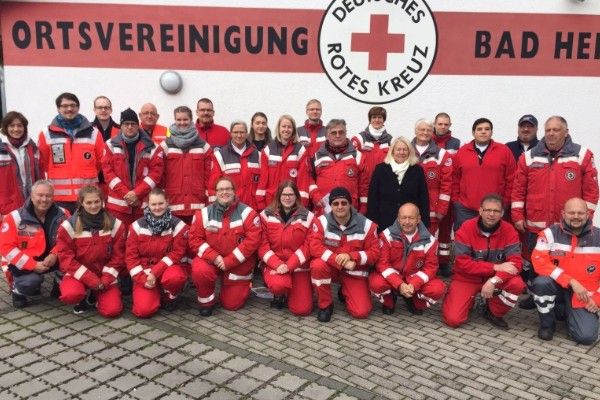 Jugend-Rot-Kreuz-Leiterin Anja Warneke, Blutspendeleiter Jürgen Trapp, 2. Vorsitzender Dr. Matthias Lotz, die Geehrte Karin Zell, 1. Vorsitzender Stefan Hartung, Bereitschaftsarzt Andreas Alles, Bereitschaftsleiter Marius Lohr und Schatzmeister Dr. Martin Schörner